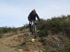 La bajada la realizamos por un sendero estrecho, pedregoso y roto con un buen cortado a nuestra derecha, que nos obliga a extremar las precauciones. Aún así imprimimos buena velocidad a nuestras monturas y disfrutamos de la bajada de apenas un kilómetro de recorrido hasta Valdesotos, pueblo en el que muere el sendero.