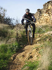 A nuestra derecha tenemos una pista que nos facilita el ascenso desde el arroyo hasta la primera trialera de la mañana. Una vez arriba nos «proteccionamos», para afrontar una senda muy disfrutona de algo más de un kilómetro que nos deposita muy cerca de Tortuero, en el puente sobre el arroyo del Olmo. Disfrutamos cada piedra de la bajada, tremendamente divertida, rápida y sin pasos excesivamente complicados.